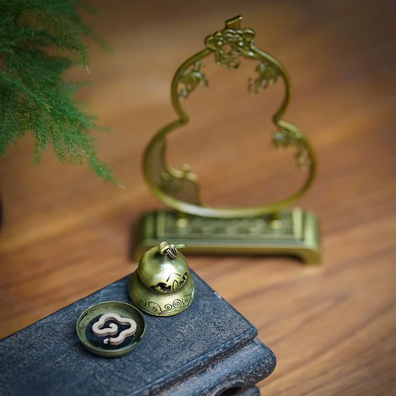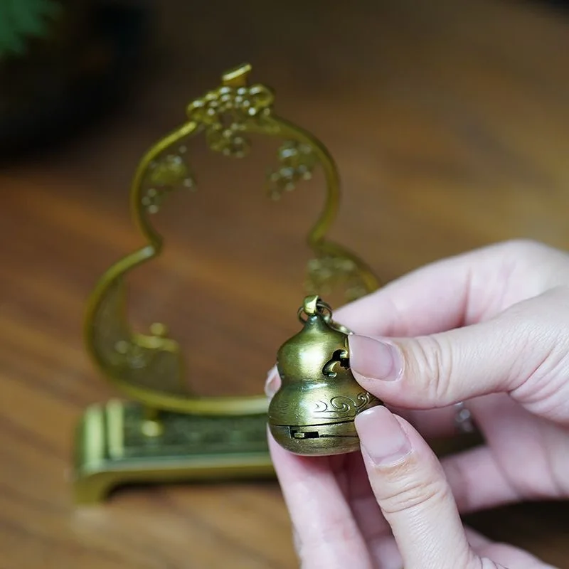 Invite prosperity and peace into your home with this masterfully crafted Gourd Incense Burner. In traditional Asian culture, the gourd (or hulu) is a powerful symbol of good fortune and longevity. This stunning piece features an ornate, antique bronze-finished alloy frame in the iconic gourd shape, from which a miniature hanging censer is suspended. Designed for use with incense cones or small coils, it allows fragrant smoke to gently curl and rise, creating a tranquil and visually captivating experience. It's a perfect blend of cultural symbolism and artistic home aromatherapy.